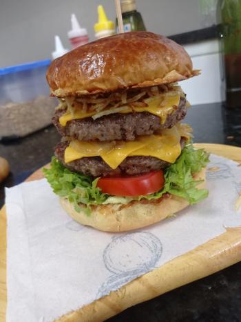 2 Hambúrgueres de 150g, Cheddar, Batata Palha, Cebola Caramelizada, Tomate, Alface Julienne, Molho Especial, Pão Brioche